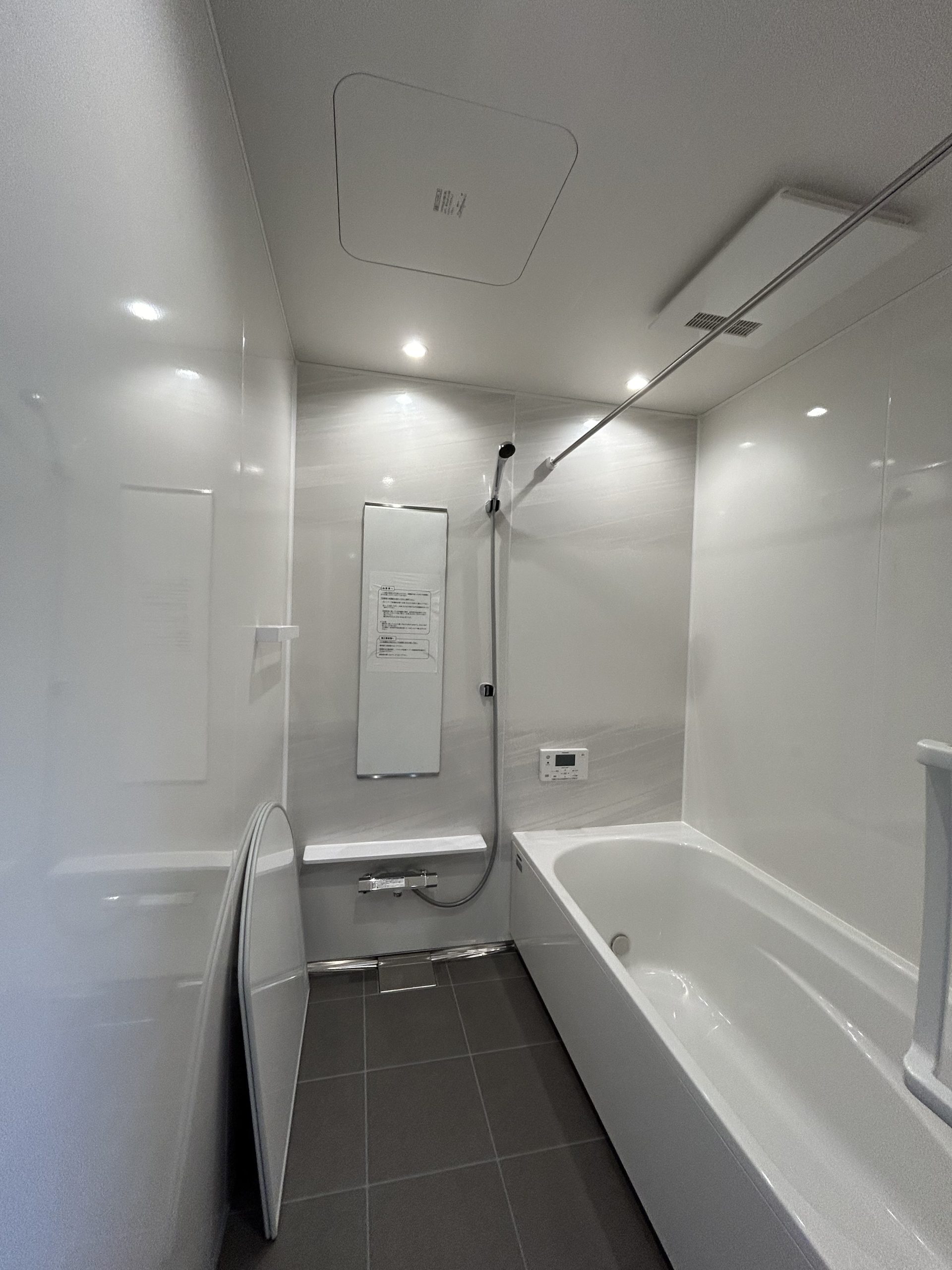 洗面脱衣室も白を基調とし、洗面台の扉をブラウン色にして飽きの来ない空間にしています。