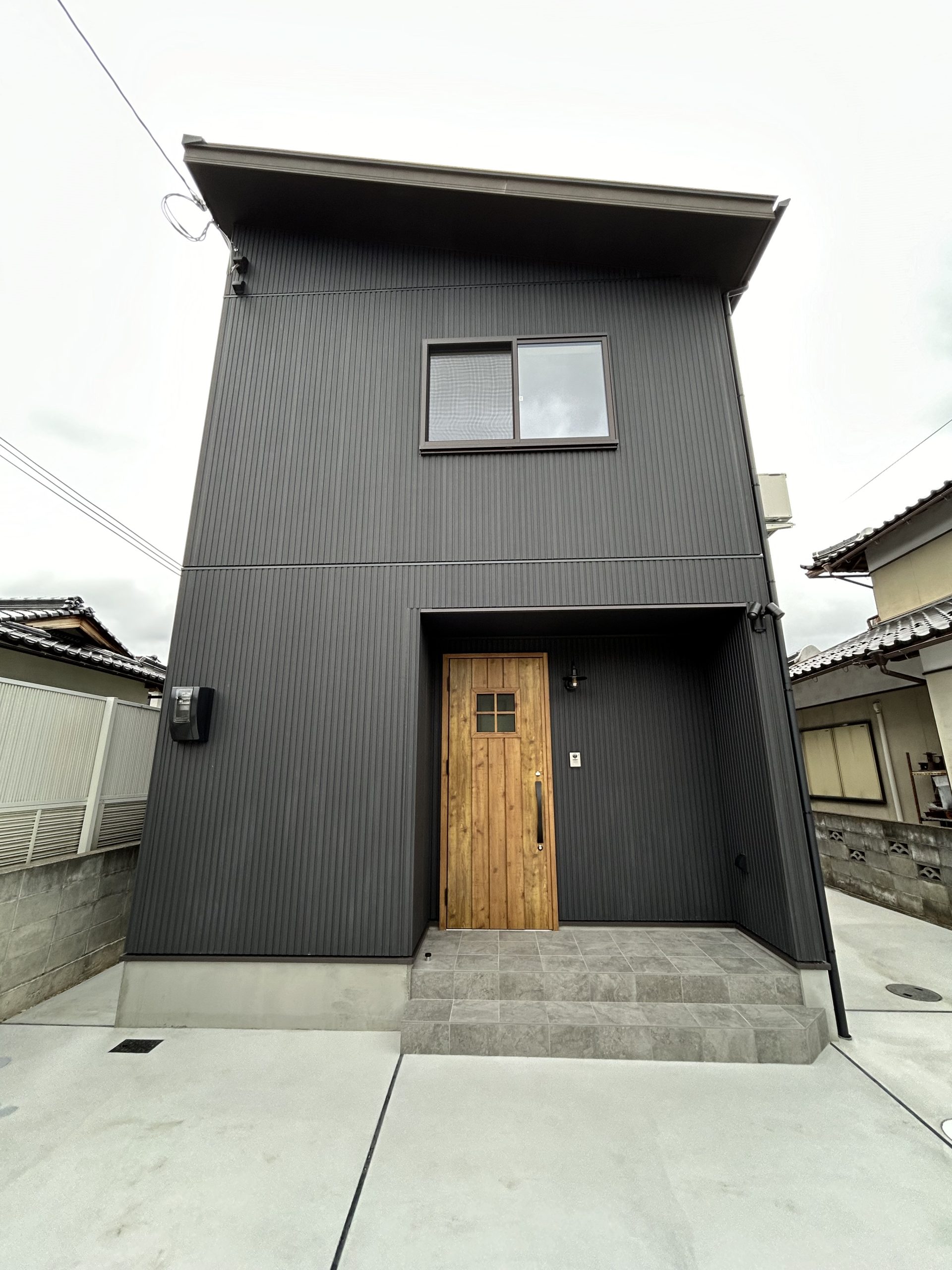 黒のストライプが基調となった外壁で、木目調の小窓付きの玄関ドアがアクセントとなり、可愛らしさがある中でも引きしまった印象を与えています。